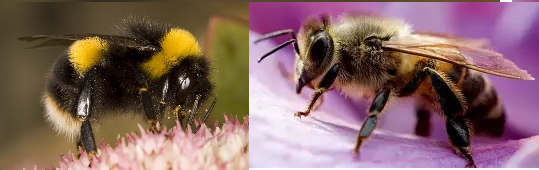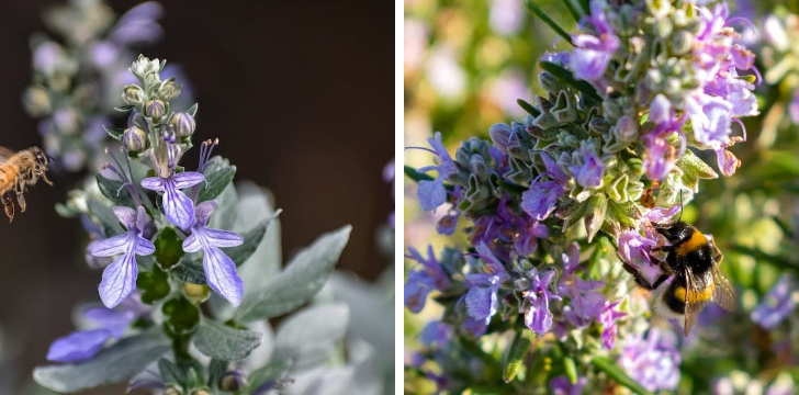 Abeille domestique et bourdon terrestre en train de butiner une germandrée arbustive et une fleur de romarin